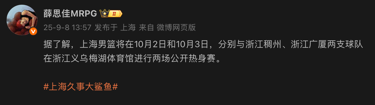 篮球媒体人薛思佳报道,“据了解,上海男篮将在10月2日和10月3日,分别与浙江稠州、浙江广厦两支球队在浙江义乌梅湖体育馆进行两场公开热身赛。”