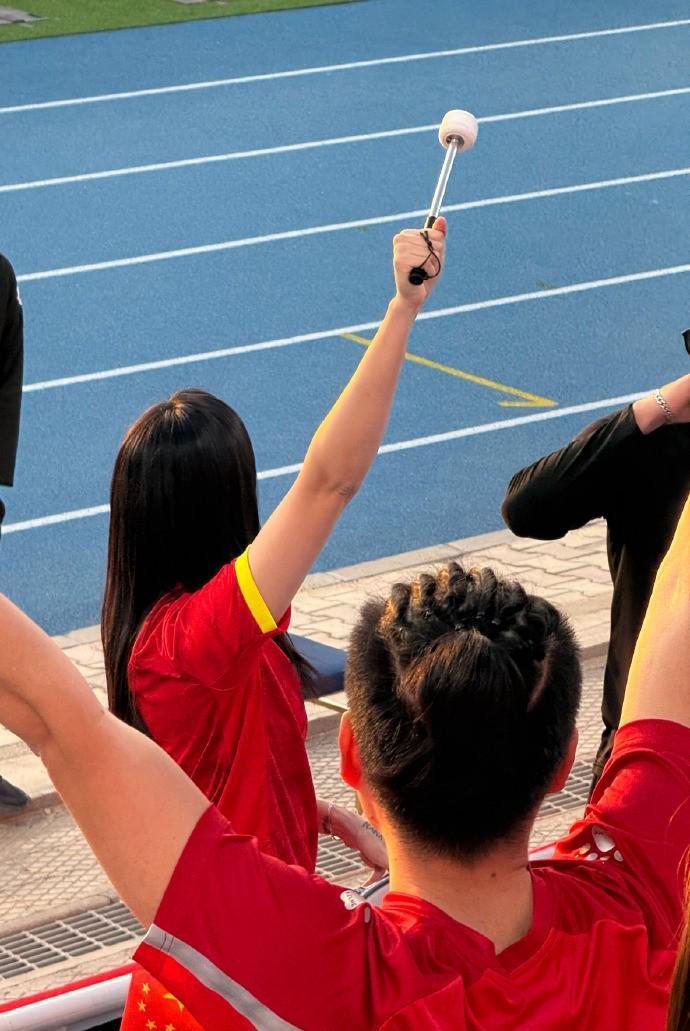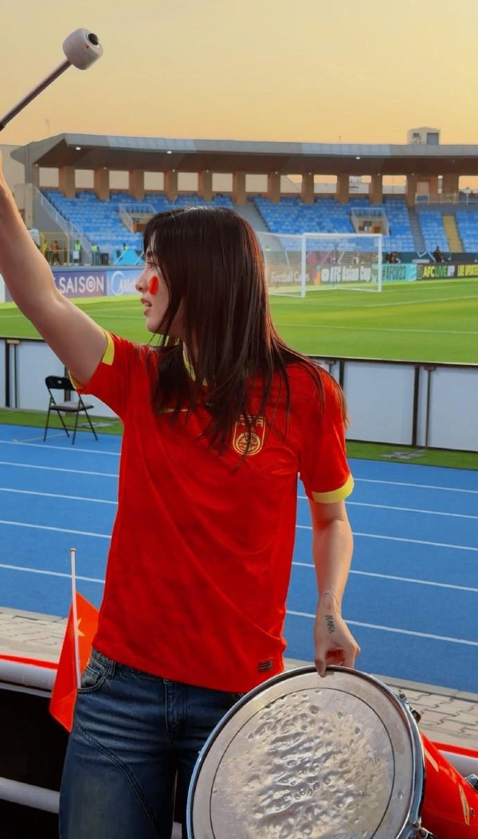 她在现场还与球迷们热情互动,主动打起了战鼓,为中国队加油助威。