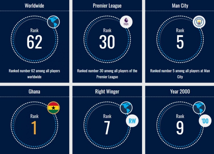 此外,塞梅尼奥是加纳籍球员身价第1、曼城队内身价第5和英超联赛身价第30。他在全球右边锋球员中位列第7、全球球员身价位列第62,同时在2000年出生的球员中位列第9。